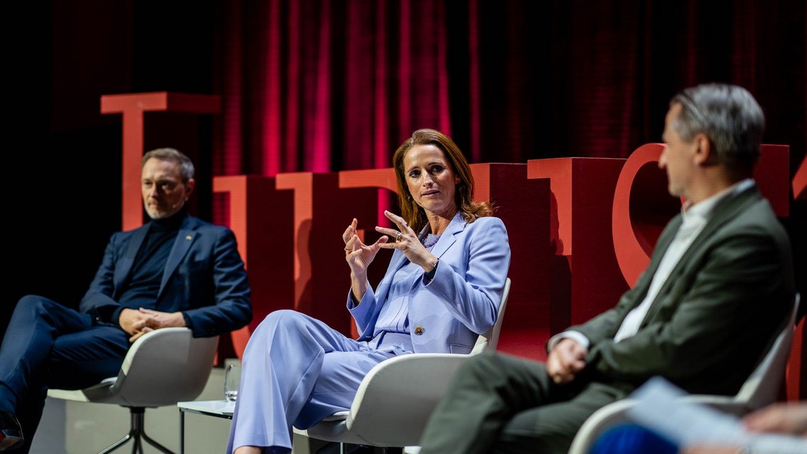 Auf dem Podium diskutierten Verena Pausder (Vorsitzende des Vorstands beim Startup-Verband), Nikolaus Blome (Ressortleiter Politik und Wirtschaft bei RTL und n-tv) und Christian Lindner (ehemaliger Bundesfinanzminister) über die wirtschaftliche und politische Lage Deutschlands nach neun Monaten neuer Bundesregierung.